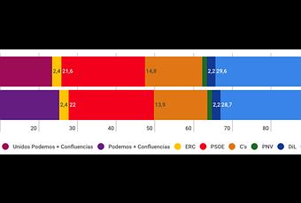 - El PP subiría casi un punto con respecto a 2015 aunque en escaños perdería representación al pasar de 123 a 121 escaños. Lo mismo le ocurriría a Ciudadanos, que mejoraría casi en 1 punto sus resultados pero se quedaría en los actuales 40 diputados.
