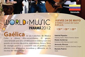 Gaélica es un colectivo de Música Celta y ritmos Afro-venezolanos. El grupo, caracterizado por una versátil esencia latina y con una puesta en escena dinámica, espontánea, fresca, llena de energía positiva y conexión con el público, nos plantea una alternativa novedosa y diferente en la programación del World Music. Como siempre es una buena oportunidad y un privilegio que nos ofrece Oscar Producciones y el World Music Panamá 2012, de poder descubir estos ritmos y estos conjuntos que difunden su mensaje musical de primera calidad a lo largo y ancho del mundo. ATENEO EN LA CIUDAD DEL SABER! EL 24 DE MAYO A LAS 8:00PM.