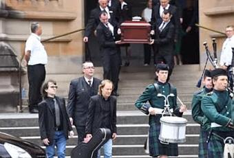Según los reportes, un puñado de fans se congregaron en el lugar para presentar sus respetos al difunto, cuya salida de la catedral fue acompañada por un extenso grupo de gaiteros escoceses (tal y como podemos ver en los siguientes vídeos).