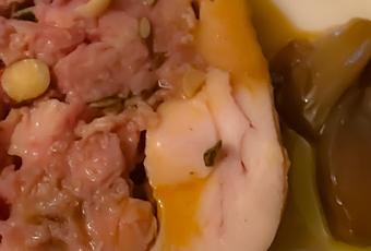 1 pollo casero deshuesado**50 gr. de piñones o otro fruto seco150 gr. de salchichas150 gr de magro de cerdo a dados1 huevo1 cucharadita de vino de jerezsal y pimientaAceite de oliva