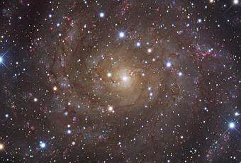 A una distancia relativamente cercana de 6,5 millones de años luz, IC 342 sería una de las galaxias más brillantes en el cielo si no fuera por su ubicación desfavorable, situada desde nuestra perspectiva a sólo 10,5 grados del ecuador de la Vía Láctea. Oscurecida por la materia interestelar de la Vía Láctea, su luz se atenúa en gran medida (en 2,4 magnitudes) antes de que llegue a nosotros y su campo se llene con estrellas en primer plano de la Vía Láctea. IC 342 es un miembro del grupo cercano IC 342/Maffei. Este grupo contiene aproximadamente 16 miembros, entre ellos los dos miembros dominantes, las galaxias IC 342 y Maffei 1. Éste cúmulo galáctico representa el agrupamiento de galaxias más cercano a nuestro grupo local y la evidencia habla de una interacción con el grupo local hace unos ocho millones de años. Las galaxias más luminosas en el grupo son la espiral gigante IC 342, la elíptica Maffei 1, y la espiral intermedia Maffei 2. Maffei 1 no sólo es la más cercana al grupo local sino que también su luz se atenúa ópticamente en 5.3 magnitudes debido al disco central de la Vía Láctea. IC 342 es una espiral de dos brazos abiertos y la galaxia más cercana a la Vía Láctea con un anillo estelar circumnuclear.