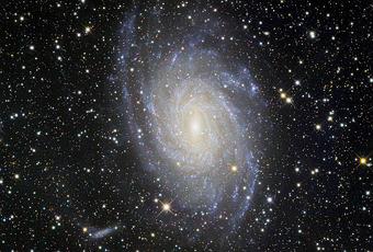 El núcleo amarillento de esta galaxia gigante está dominado por la luz procedente de estrellas antiguas y frías. Más allá del núcleo, los brazos espirales llenos de pequeños cúmulos de estrellas azules y jóvenes y de regiones rosadas de formación estelar se extienden más allá de una galaxia satélite más pequeña (en la parte inferior izquierda) que recuerda a la Gran Nube de Magallanes, la galaxia satélite de la Vía Láctea.