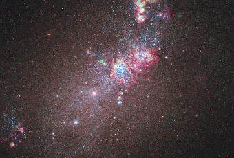 Los jóvenes cúmulos de estrellas nuevas aparecen dentro de nubes brillantes de gas resplandeciente. Cada nube brilla debido a la fuerte luz ultravioleta emitida por las estrellas jóvenes integradas, que se han formado dentro de las nubes, debido al colapso gravitatorio del gas. Estas estrellas calientes también arrojan rápidos vientos estelares, que se mueven a millones de kilómetros por hora (miles de kilómetros por segundo), que surcan el gas circundante. La radiación y el viento de las estrellas jóvenes literalmente crean burbujas en el gas.