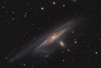 Las grandes galaxias crecen consumiendo las pequeñas. Las galaxias, incluso, practican el canibalismo galáctico absorbiendo pequeñas galaxias que se acercan demasiado y son capturadas por la gravedad de las grandes. De hecho, es una práctica habitual en el Universo como se ilustra en esta pareja de galaxias en interacción que hay en la orilla de la constelación meridional de Eridanus, el Río. La gran espiral NGC 1532, situada a más de 50 millones de años luz de distancia, se ve envuelta en una lucha gravitatoria con la galaxia enana NGC 1531 (a la derecha del centro), una lucha que, a la larga, perderá la galaxia más pequeña. La espiral NGC 1532, que se ve de lado, abarca unos 100.000 años luz de diámetro. Se cree que la pareja NGC 1532/1531, que se ve en esta imagen, es similar al sistema de espirales conocido como M51.
