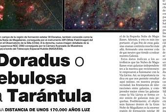Artículo publicado en el Suplemento Dominical "El Zoco" de Diario Córdoba el domingo 3 de abril de 2011. El panel izquierdo muestra una imagen de gran campo de la región de formación estelar 30 Doradus, también conocido como la Nebulosa de la Tarántula, en la Nube de Magallanes. Imagen conseguida por el instrumento WFI (Wide Field Imager) del telescopio de 2m MPG/ESO en el Observatorio de la Silla (Chile). El panel derecho muestra nueva imagen detallada de la región alrededor del resto de supernova NGC 2060 conseguida por la Cámara Avanzada de Muestreos (Advanced Camera for Surveys) a bordo del Telescopio Espacial Hubble (NASA/ESA). Ya hablé de estas imágenes en esta historia. Crédito: NASA/ESA y ESO.
