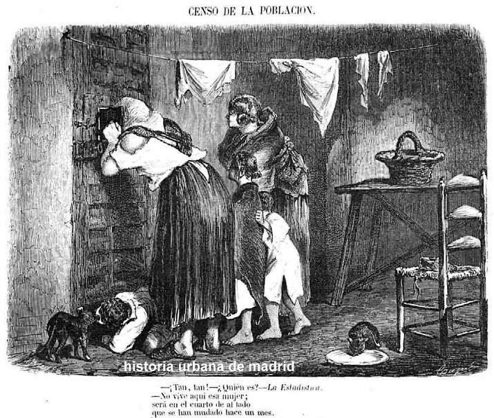 El Censo Nacional, según empadronamiento general de 23 de diciembre de 1860, nos decía que en Madrid había 489.332 habitantes. El Museo Universal, de 6 de enero de 1861, tiene una idea quizá más aproximada de la veracidad del resultado. Así lo expresa en el siguiente grabado: