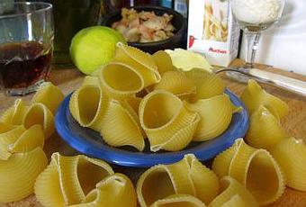 Me pareció que una buena idea sería mezclar esta receta típica chilena con un tipo de pasta que tuviera en caracter “marino”. Y por eso pensé en los galets, que yo siempre he conocido como “tiburones”. Los galets o tiburones son como conchas de pasta pero más grandes, y muchas veces se presentan rellenos.