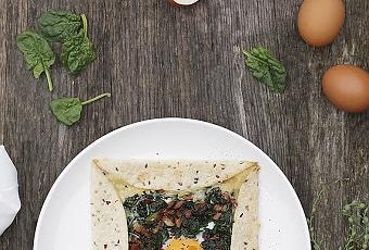 Ingredientes:- 1 fajita Multigrain de Mission Wraps.- 2 lonchas de bacon ahumado.- 75 g de espinacas frescas.- Queso emmental.- 1 huevo.- Pimentón en escamas La Chinata.