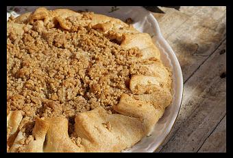 Para hacer el crumble, ponemos en un bol la mantequilla fría cortada a trocitos, la harina, el azúcar, la canela y las nueces molidas o cortadas a trocitos, y las mezclamos con la punta de los dedos formando migas que echaremos por encima y en el centro de la galette, cubriéndola por completo.