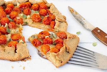 La galette es una especie de tarta, en este caso utilicé harina de quinoa para hacer la masa, a la que le incorporé romero y tomillo picados, caramelicé unas cebollas y para el queso elegí el azul ó tipo Roquefort para intensificar el sabor y para darle color elegí unos tomates cherry deliciosos.