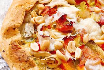 Masa brisa1 puerro1 pimiento rojo1 pimiento verdeCalabaza en láminasParmesano PerejilSalPimienta blancaCacahuetes