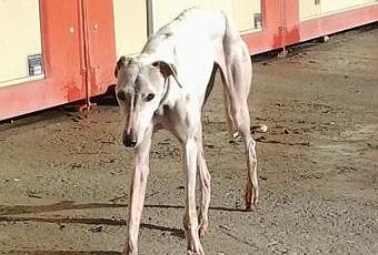 Nos dan el aviso de esta galga, que está en los huesos y corre peligro en la calle, por la zona en la que está.