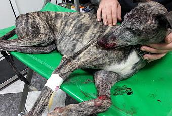 tiene una fuerte contusión en el lado delantero izquierdo lo que le a causado la rotura de la pata, múltiples heridas y en definitiva un abandono absoluto.