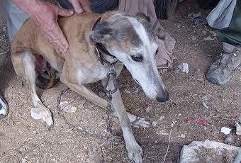 Y una galga preciosa, que dice que se la dieron los gitanos, hace unos años, cuando se cansaron de cazar con ella. La tiene allí desde entonces, vive encadenada a un bidón...y tiene TANTO miedo, que no sale nunca del bidón. Dice que tendrá ya 10 añitos.