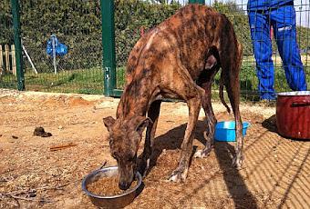 Es un galguito jóven de no más de 2 años, apareció por la urbanización de un amigo mio, lo está alimentando y lo mantiene en su puerta, pero no quiere acogerlo porque tiene sarna y el tiene muchos animales en casa. Está muy delgado.