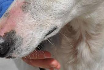 Observaciones: Galguito tranquilo y tímido, lleno de cicatrices debido a una vida de maltrato y sufrimiento. Tiene el hocico un poco irritado por lo que necesita atención veterinaria cuanto antes para ver que puede ser.