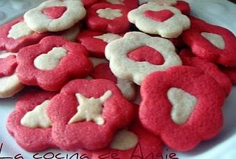 - Dividir la masa en dos y a una parte añadir colorante rojo. Estirar cada masa y cortar con un cortapastas, intercambiando los colores (el relleno rojo en la galleta blanca, y viceversa. Hornear a 180º durante 12 minutos.