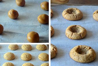 En un cuenco tamizamos la harina junto con el bicarbonato y la levadura, por otro lado en otro cuenco añadimos la mantequilla, la crema de cacahuete, todo el azúcar y el huevo. Mezclamos bien hasta que este todo bien integrado, a continuación vamos agregando la harina poco a poco mientras vamos mezclando con una cuchara de madera, cuando este prácticamente incorporado si nos es muy difícil con la cuchara de madera lo haremos con las manos, si la seguimos notando pegajosa podremos añadir un poco mas de harina hasta que no se pegue. Una vez todo bien integrado formaremos una bola, dividimos en dos damos forma de cilindro y envolvemos en film transparente, e introducimos en la nevera de 3 a 4 horas, transcurrido este tiempo precalentamos el horno a 180ºC con calor arriba-abajo sin ventilador.