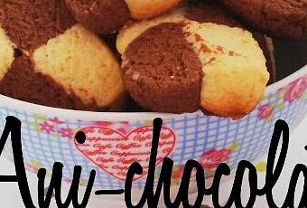 Tamizamos la harina en un cuenco. Preparamos una masa mezclando de forma rápida con las manos, la harina, la levadura, el azúcar, la sal, el huevo y la mantequilla. Dividimos la masa en dos partes y añadimos a una de ellas el cacao. Envolvemos las dos porciones en papel film y las dejamos en la nevera unos 30 minutos. Preparamos unas tiras de unos 15cm de largo (yo hice cuatro churros largos y poco a poco les fuí dando forma). Colocamos una tira negra al lado de otra blanca y las juntamos presionando suavemente. A continuación, colocamos encima de estas dos cintas otras dos, pero en el orden contrario (negro sobre blanco y blanco sobre negro), y de nuevo presionamos suavemente. Cortamos láminas finas y las colocamos en la bandeja del horno forrada con papel vegetal. La llevamos al horno precalentado a 200ºC, unos 15 minutos aproximadamente.