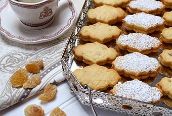10. Una vez bien frías, pegamos cada dos galletas con mermelada de naranja o de albaricoque (para facilitarnos la tarea, calentamos la mermelada en un cazo preferentemente con glucosa sino calentamos la mermelada sola). Decoramos con azúcar glas y ¡¡degustamos con un buen café o una buena taza de té!!