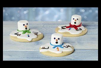 Precalienta el horno a 180°C. En un recipiente y con la túrmix, bate la mantequilla y el azúcar. Una vez que estén bien mezclados, agrega el huevo y el extracto de vainilla. Aparte, mezcla bien la harina y la levadura. En tres partes, agrega la mezcla de harina a la mezcla de mantequilla, revolviendo muy bien después de cada adición. La última parte de la harina, mézclala a mano; debe quedar una masa dura. Divide la masa en dos bolas y guárdalas envueltas en film en el refrigerador durante dos horas. Con un poco de harina en las manos, haz bolitas con la masa como de tamaño de una ciruela. Aplánalas con los dedos para formar las galletas. Pon las galletas en una bandeja para hornear con papel sulfurizado. Hornéalas 6-8 minutos, hasta que los bordes de las galletas se empiecen a dorar. Deja enfriar las galletas en una rejilla mientras se prepara el glaseado: mezcla la leche con el azúcar glas. Agrega el jarabe de maíz y revuelva bien. Decora las galletas con el glaseado blanco, coloca los marshmallows pegados al glaseado y dibuja la carita, brazos y botones con los geles de colores.
