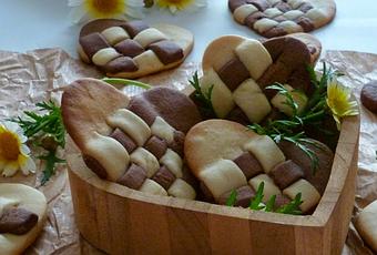 Estiramos la masa de vainilla entre dos hojas de papel vegetal, cortamos en forma de corazón, le cortamos un extremo, retinamos la masa sobrante y hacemos varios cortes paralelos en un extremo. Hacemos lo mismo con la masa de chocolate y entrelazamos ambos lados formando un solo corazón. Llevamos a la nevera unos 30 minutos.Horneamos unos 12 minutos o hasta que estén doradas. Dejamos enfriar sobre una rejillas.
