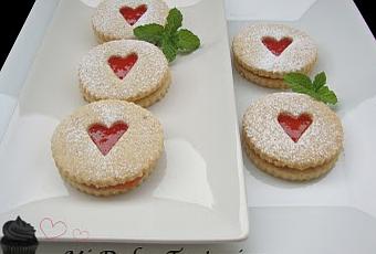 Para las galletas: - 90 grms avellanas molidas. - 90 grms azúcar. - 290 grms harina.- 1/2 cucharadita de levadura en polvo - 1 yema.- 180 g mantequilla. - ralladura de 1 limón. - 1/2 cucharadita de canela. - 1 vaina de cardamomo. - 1 cucharadita de azúcar glass.- Sal.Para el relleno: - 115 grms de mermelada de tomate.- 1/2 hoja de cola de pescado.Preparación: