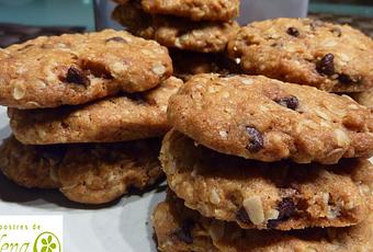 En un bol echamos la harina, la avena, la ralladura de naranja y el azúcar. Incorporamos la mezcla anterior y amasamos un poco la mezcla con las manos y por último ponemos los chips de chocolate.