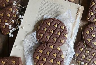 Poner en un bol la mantequilla que deberá estar a punto pomada, se bate hasta blanquearla un poco. Se le añade el azúcar y se mezcla, añadir el huevo batido poco a poco y se incorpora junto a la vainilla.Se añade la harina, el cacao y la sal tamizando. Integrar bien. Se envuelve en un papel film y se lleva a la nevera por 30 minutos. Se estira con un rodillo entre dos hojas de papel vegetal y cortar cuadrados, llevar a la nevera unos 30 minutos.Ponemos encima de la masa el texturizador y presionamos un poco, cortamos un el cortador redondo o deseado y retiramos la masa sobrante. Se colocan en la bandeja del horno forrada con papel vegetal. Se lleva a la nevera hasta que el horno esté caliente.Precalentar al horno a 160ºCHornear unos 15 minutos. Dejamos enfriar sobre una rejilla.DecoraciónDiluimos el polvo dorado en unas gotas de Vodka y con un pincel pintamos los corazones sobresalientes. Dejamos secar.Guardar en una lata o tarro hermético.