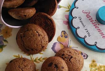 Preparación: Fundir la mantequilla en el microondas (2 ciclos de 20 segundos). En un bol mezclar la harina, la levadura y la sal. En otro bol mezclar todos los azúcares y las especias. Picar el chocolate y las avellanas con el robot.