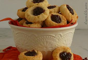 Hacemos unas bolitas no muy grandes, rebozamos en coco seco rallado, las colocamos sobre una bandeja forrada con papel vegetal. Le hacemos un hoyo en el centro que rellenamos con dulce de membrillo.