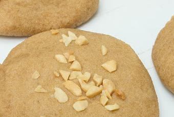Poner los anacardos en trocitos sobre la masa y luego aplastarlos un poco con el dedo para que luego no se caigan una vez tostados.