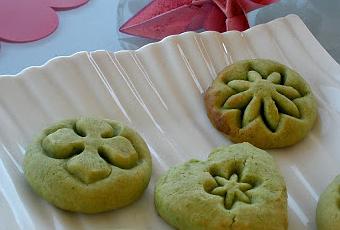 Estas galletas son muy populares en china y se hacen para celebrar el comienzo del año chino. A mi me ha sorprendido por el ingrediente que le aporta un color verdoso suave y que las hace diferentes a todas las vistas anteriormente, después me ha sorprendido su sabor dulce con un toque salado... ellos las hacen con forma de nuez, pero yo he querido aportar una decoración algo diferente.