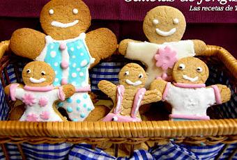 Hoy traemos el primer intento de hacer galletas decoradas...la semana pasada viendo que el día no estaba para ir a la playa, encimera al canto y a intentar decorar las galletas que previamente habíamos preparado...Creo que para ser el primer intento no estuvo nada mal el resultado, la familia de Galletas de Jengibre ven la luz en nuestro blog...Parece ser que a la matriarca y a la pequeña les entro el gusanillo de la decoración de galletas, tartas y cupcakes...como esta de moda, se contagiaron... habrá que preparar el bolsillo, ya que en nuestro viaje a Madrid de hace unos días ya visitamos "La tienda Americana" y empezamos invirtiendo, por cierto después de venir a vivir a Huelva desde la capital, no me acordaba de lo imposible que era aparcar en Madrid, horrible...horrible...Próximamente seguiremos con mas inventos artísticos de este tipo...uhmmmmmmmmmmm...en mente un proyecto de una tarta decorada a tamaño real de la "Catedral de Sevilla" rellena de chocolate y crema de caramelo...jajajajaja....esta en mente....!!!Bueno, los comentarios positivos, Ok??? que nos venimos abajo...Galletas de Jengibre...Ingredientes para las galletas:75 gramos de azúcar moreno125 gramos de mantequilla en pomada1 huevo batido100 gramos de jarabe de manzana375 gramos de harina de repostería1 cucharadita de bicarbonato sódico1/2 cucharadita de levadura química1 cucharadita de canela molida2 cucharaditas de jengibre molidoPreparación de las galletas:1.- Deshacemos el azúcar moreno pasándolo unos segundo por la thermomix.2.- Ponemos la mantequilla en pomada en un cuenco junto con el azúcar glasee y mezclamos bien.3.- Añadimos el huevo batido y el sirope de manzana, batimos todos los ingredientes muy bien para que nos quede una mezcla homogénea.4.- Tamizamos la harina e incorporamos el bicarbonato, canela, jengibre y la levadura química removiendo todos los ingredientes bien.5.- Incorporamos a la mezcla anterior y trabajamos la masa con las manos hasta obtener una bola, colocamos en una mesa enharinada y extendemos, volvemos a amasar con las manos y formamos una bola, la textura debe de ser suave.6. La envolvemos en papel film y conservamos en el frigorífico durante dos a tres o horas mas o menos.7.- Para formar las galletas extendemos sobre una superficie enharinada la masa, ayudándonos de un rodillo formamos una capa de unos cinco milímetros de espesor. si la masa se nos queda pegada nos ayudamos de un poco de harina sobre el rulo.8.- Precalentamos el horno a 180 grados.9.- Con los moldes de los personajes de jengibre vamos preparando los muñecos.10.- Con la masa restante volvemos a amasar y extender para seguir confeccionando muñecos hasta agotar la masa.11.- Colocamos las figuras sobre papel de horno e introducimos en el, horneamos de 10 a 15 minutos.Para decorar:Pasta de azúcar de coloresAzúcar glaseeColorantesGlaseado blanco y de coloresFideos de chocolateFideos de coloresetc, etc..Decoración:En nuestro caso la decoración la llevo a cabo nuestra pequeña Triana con un poco de ayuda, se ayudo de utensilios que compramos en La tienda Americana, los propios cortapastas, jeringa o lápiz de decorar, etc...a veces en estas decoraciones la imaginación también cuenta bastante a la hora de decorar y preparar las decoraciones...