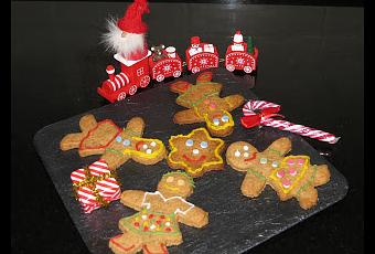 Ingredientes:- 380 gramos de harina de trigo.- 200 gramos de margarina.- 110 gramos de azúcar moreno.- 40 mililitros de agua.- 8 gramos de levadura.- 1 cucharadita de jengibre en polvo.- 1 cucharadita de canela.- 1 cucharadita de nuez moscada.- Una pizca de sal.Elaboración:Mezclamos todos los ingredientes menos la margarina y batimos cuando ya estén todos mezclados, añadimos la margarina tiene que estar blandita para que se junte bien con el resto de los ingredientes se puede mezclar con varillas o con la mano, aunque siempre hay que terminar con la mano hasta que te queda una especie de bola.Ahora colocamos un papel de horno y estiramos la masa con un rodillo y cortamos las galletas. Colocamos en la bandeja de horno a 180º durante 15 minutos hasta que se doren. Sacamos y dejamos reposar encima de la rejilla del horno para que no se nos rompan ya que son muy delicadas. Una vez que se han enfriado se colocan en un plato y con lápices pasteleros comenzamos a decorarlas.