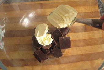 Colocamos en un bol el chocolate troceado y la mantequilla. Lo llevamos al microondas 1 minuto a máxima potencia, y lo sacamos derretido. Otra opción sería al baño maría, aunque llevaría un poco más de tiempo. Haced de la forma que más os guste, ambas funcionan para este caso.