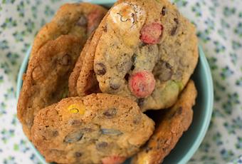 6.- Añadir los chips de chocolate, las nueces y los lacasitos y mezclar hasta que estén perfectamente integrados en la masa.