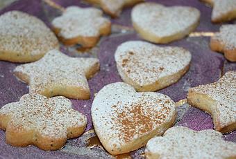 Precalentamos el horno a 180 grados.Sobre la mesa de trabajo enharinada, extendemos la masa con el rodillo, cortamos con un cortapastas las galletas. Las colocamos sobre una bandeja de horno cubierta con papel vegetal y horneamos entre 10 y 15 minutos, hasta que se doren.