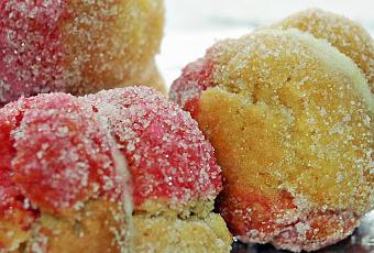 Con la masa en bloque se forman bolas del tamaño de una nuez y se colocan en una bandeja de horno con papel parafinado.Se hornean a 180ºC unos 20 minutos aproximadamente.Cuando están calientes se pueden ir vaciando. Las migas de bizcocho se pueden mezclar con el queso. Yo no las ahuequé. Solo usé un poco de queso para unir las dos galletas. Se pone un poco de leche en dos recipientes. A uno se le pone colorante rojo y al otro amarillo.Se van pasando las dos mitades de los melocotones por cada color. No se mantienen mucho tiempo para que no se empapen demasiado, pues se romperían.Se pasan por azúcar granillo y se presentan.