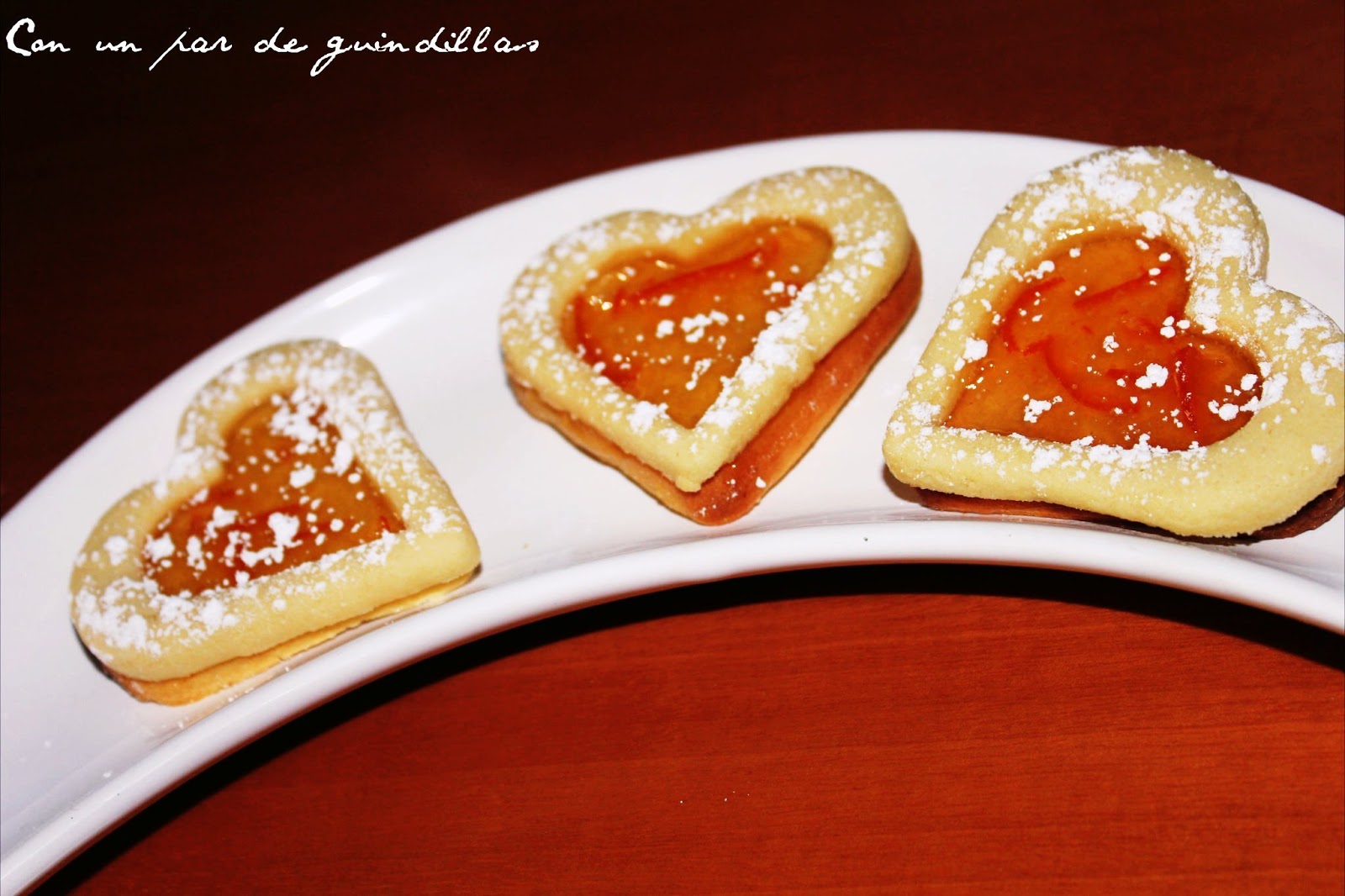6.- Calentamos la mermelada un poco, removiendo hasta que quede uniforme. Pintamos la base de las galletas con mermelada, colocamos encima una galleta con agujero y finalmente las espolvoreamos con azúcar glass.