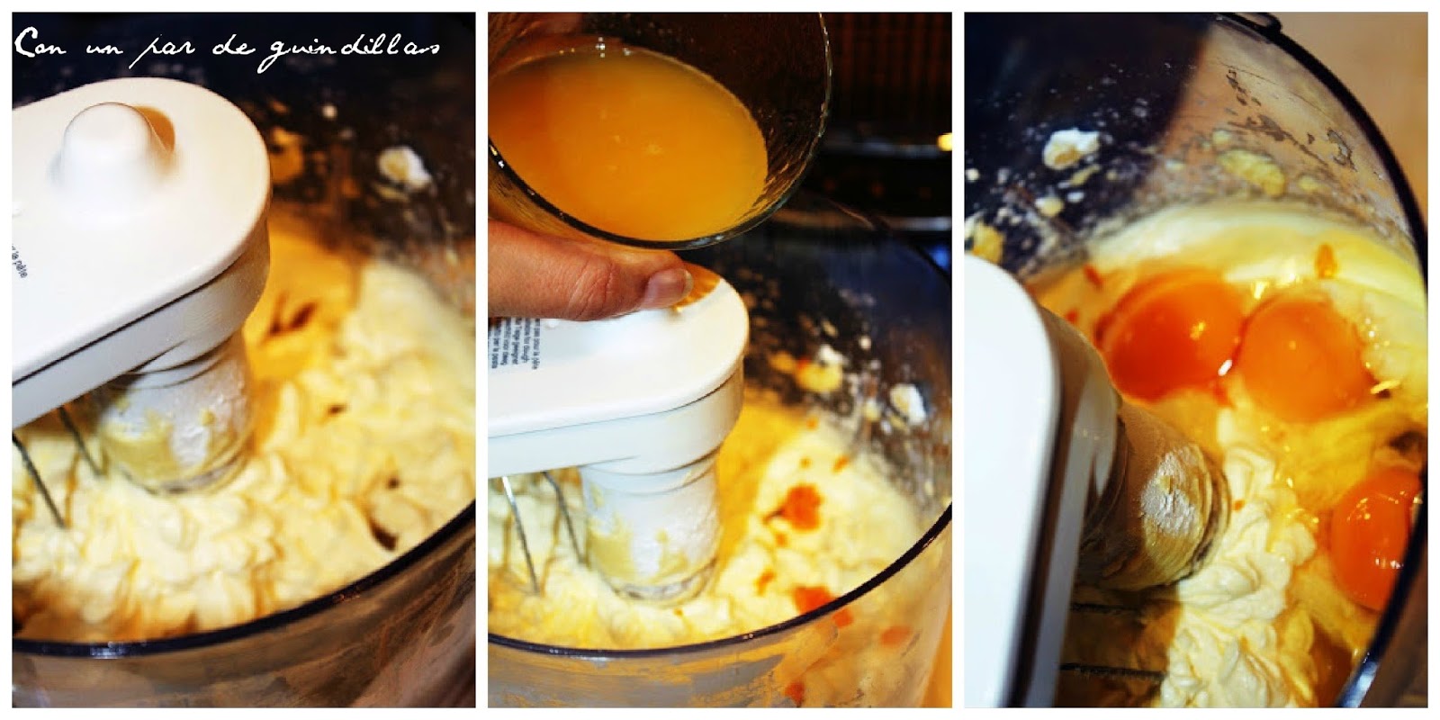 ahora la piel de naranja, el zumo, las yemas y el huevo, y batimos