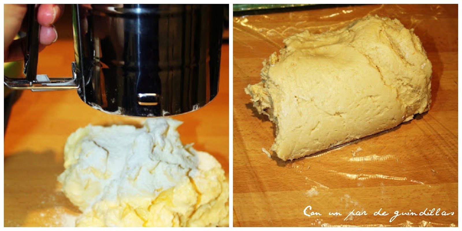 3.- Tamizamos por encima la harina y la mezclamos con la sal y la levadura. Amasamos bien con las manos, hasta que la masa no se pegue a los dedos. La envolvemos en papel film transparente y a la nevera al menos 2 horas.