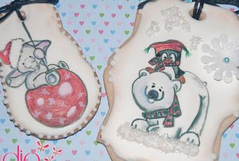 Estas galletitas son pintadas a mano sobre una superficie lisa de glasa, con algún mínimo adorno de glasa, con copos de nieve cortados con troqueladora con papel de arroz y alguna perla de azúcar de adorno