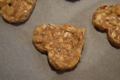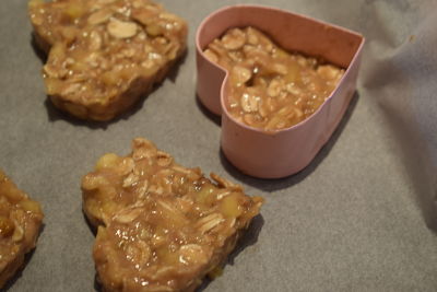 Sobre un papel de sulfurizado colocado en la bandeja del horno vamos formando las galletas. Yo utilicé un molde de galletas en forma de corazón. Si no tienes o no quieres usar el molde, puedes ir poniendo cucharaditas de la masa, las aplanas un poco y será suficiente.