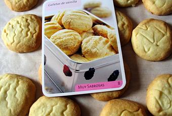 Galletas de vainilla:50 g de harina de maíz, 200 g de harina de trigo, 1 vaina de vainilla, 200 g de mantequilla o margarina, 1 pizca de azúcar avainillado, 80 g de azúcar glas.Elaboración:Tamizamos la harina de maíz y la de trigo. Abrimos la vaina de vainilla y extraemos la pulsa. Amasamos las harinas con la vainilla, la mantequilla o margarina, el azúcar avainillado y el azúcar glas hasta obtener una masa uniforme. Formamos con ella 2 rollos de 30 cm de longitud. Tapar y dejar enfriar durante 2 horas para después cortarlos en rodajas de 1 cm de grosor y formar bolas. Forramos una bandeja de horno y las colocamos encima, aplastándolas con cuidado con un tenedor enharinado. Las coceremos en el horno (previamente precalencado) a 190ºC durante unos 15 minutos. Enfriar y guardar.