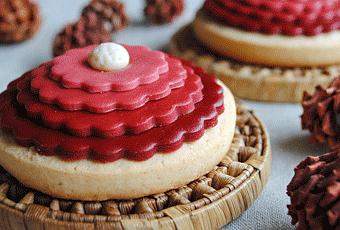En mi caso, para las galletas redondas utilicé fondant teñido de varios tomos de burdeos, corté discos de varios diámetros y coloqué el fondant a capas para conseguir el efecto degradé que veis en las fotos (las capas van adheridas entre sí con una pizca de agua). Rematé la decoración con una bolita de fondant blanco que pinché con un palillo por toda su superficie.
