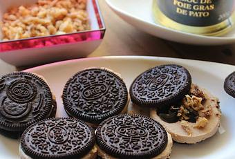 Primero separamos una de las galletas oreo-con cuidado, que no se rompa al hacer el giro para separarlas-. Quitamos con un cuchillo de punta el relleno y lo dejamos en un cuenco. Este relleno no lo vamos a tirar ni mucho menos, metedlo en la nevera que nos servirá para otra receta dulce que ya publicaré, otra idea original.