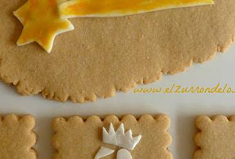 Precalentamos el horno a 180º C.Cubrimos la bandeja del horno con papel vegetal.Estiramos la masa, entre dos hojas de papel vegetal, dejándola de un grosor no más de 1 cm.Cortamos la masa con el corta pasta y las vamos colocando sobre la bandeja de horno.Horneamos unos 12-13 minutos, o hasta que esté tostadas.Dejamos enfriar sobre unas rejillas.Hacemos los Reyes Magos con fondant, los pegamos en las galletas y con los coloreamos con los polvos.