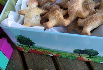Fundimos un poco de mantequilla en el microondas y pintamos las galletas. a continuación espolvoreamos abundantemente con azúcar y al horno precalentado a 200º durante 15 minutos.