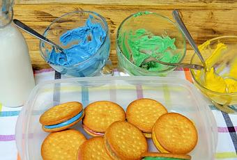 INGREDIENTES:- Galletas María.- Nocilla blanca.- Colorantes rojo, azul, verde y amarillo.